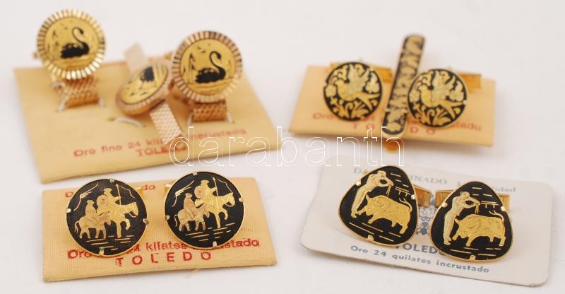 Beschreibung: 4 pár dekoratív arany-kék színű mandzsettagomb, 2 pár közülük hozzá illő nyakkendőtűvel