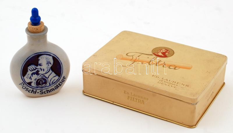 Beschreibung: Bajor gyártmányú Pöschl-Schmalzler burnótos palack, benne burnóttal + Régi fém Filtra cigarettásdoboz, 15×11×4 cm