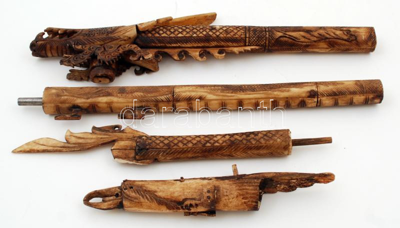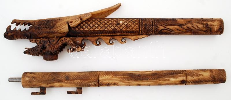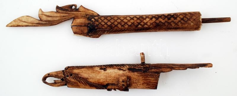 Csontból készült, gazdagon díszített, faragott indonéz fúvócső nyíltartó tokkal, kis sérüléssel, h: 104,5 cm / Richly ornated, carved blowgun made from bone with case, a bit damaged, length: 104,5 cm