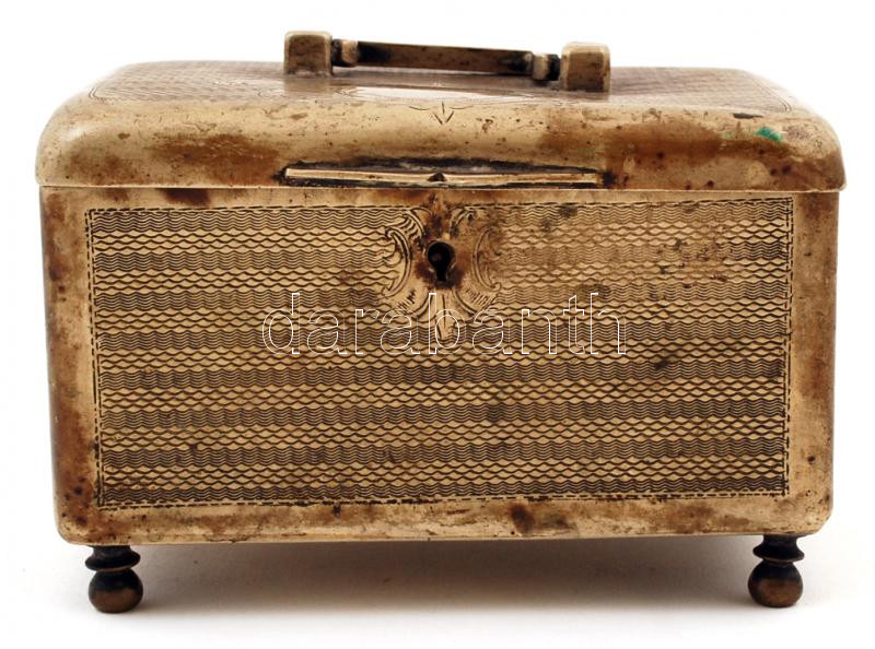 Beschreibung: Díszes, alpakka doboz, zárható, kulcs nélkül, 14x10x11cm