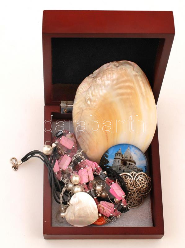 Beschreibung: Érdekes bizsu tétel fa dobozkában, nyakláncokkal, kulcstartóval, levélnehezékkel