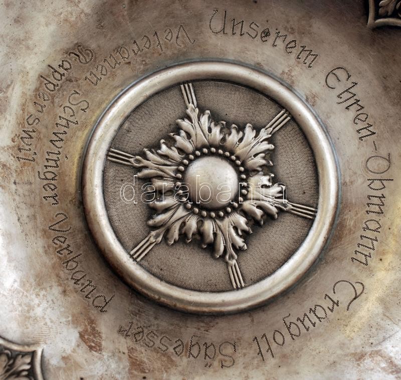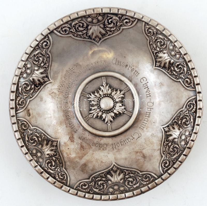 Beschreibung: Ezüstözött dísztál, fém, jelzett, d:26 cm, m:6,5 cm