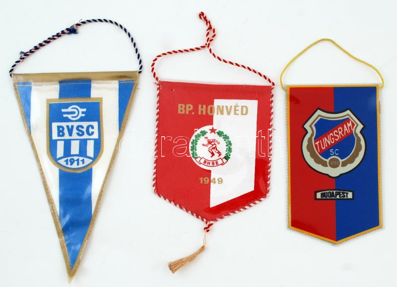 Beschreibung: Foci zászlók a 80-as évekből 3 db: Budapesti Honvéd, BVSC, Tungsram, műanyag tokban, 13×11-20×13 cm