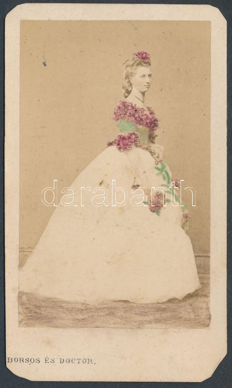 cca 1865 Borsos és Doctor pesti műtermében készült vizitkártya (9401-es felvétel számmal), a hölgyet virágba öltöztették, a képet kézzel színezték, a karton sarkait levágták, 10,5x6 cm