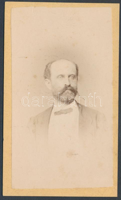 cca 1870 Sztregovai és kelecsényi Madách Károly (Madách Imre öccse) (? – 1888) földbirtokos, Nógrád megye alispánja portréja, Beszédes Sándor esztergomi fényképész műterméből, vizitkártya méretben, keményhátú fotó, az album lapján feliratozva, 10x6 cm