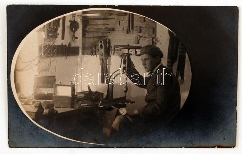 cca 1910-1920 A mester a műhelyében, fotólap, 14x9 cm https://www.darabanth.com/de/231-Fernauktion/231.0/Andere-Sammelgebiete/Foto~600147/cca-1910-1920-A-mester-a-muhelyeben-fotolap-14x9-cm~II1046273