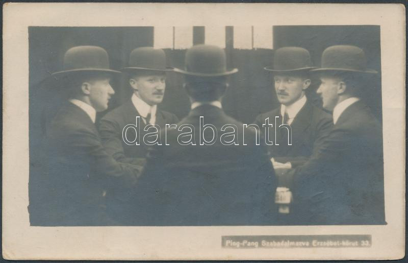 cca 1910 Ping-pang szabadolommal védett trükkös fotó, az ügyesen elhelyezett tükrükben ugyanaz a háttal ülő személy látható, a kép egy expozícióval készült, fotólap, melynek hátoldalán gyermek írás, 9x14 cm