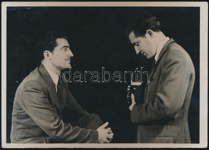 cca 1950 Trükkfotó, portré önmagáról (sötét háttér előtt, két vakufelvillanás, nyitott zárszerkezetű fényképezőgép előtt, s közben helyváltoztatás), 9x13 cm