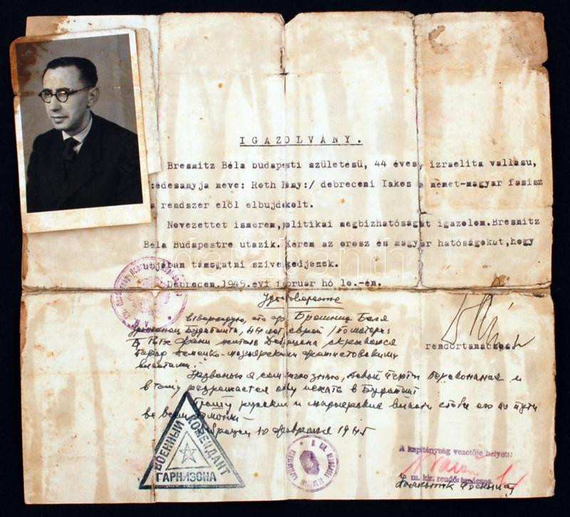 Beschreibung: 1945 Debrecen, Bresnitz Béla izraelita vallású személy (Gáll István Kossuth-díjas író apósa) szabad Budapestre utazását biztosító igazolványa