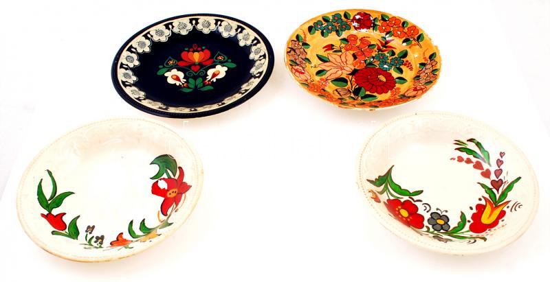 Beschreibung: 4 db dekoratív, népi motívumos Gránit falitányér, kézzel festett, jelzett, az egyik kopásnyomokkal, d: 21,5-23,5 cm