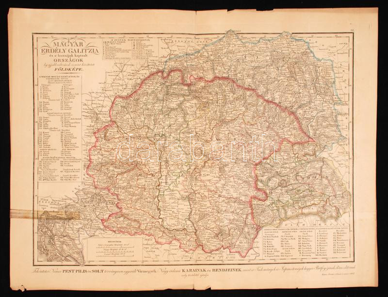1837 Magyar, Erdély, Galitzia és a' hozzájok kaptsolt országok leg ujjabb változások szerént készíttetett földképe. Színezett rézmetszet, papír, szélein kis szakadásokkal, egy helyütt ragasztással, 35×48,5 cm Karacs Ferenc (1770-1838) térképkészítő, rézmetsző térképe, Pest-Pilis-Solt vármegye karainak és rendjeinek ajánlva.