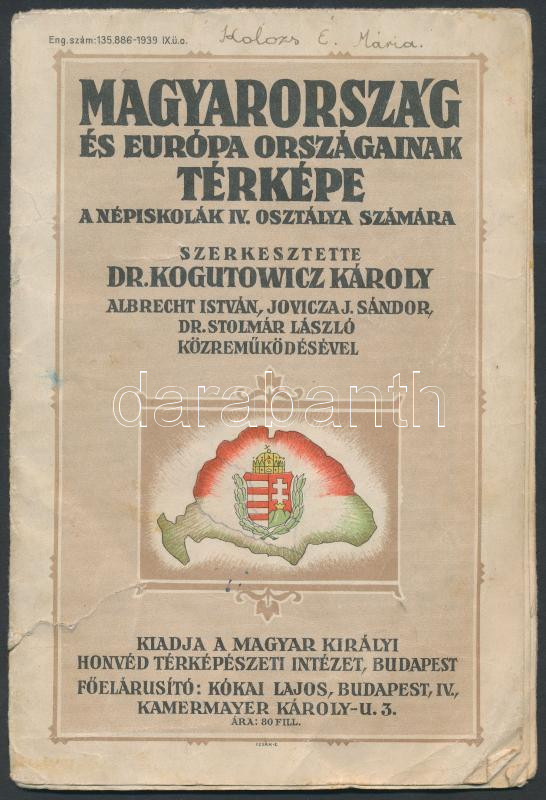 Magyarország és Európa országainak térképe, a népiskolák IV. osztálya számára. Szerk.: Kogutowicz Károly. Bp., Magyar Királyi Honvéd Térképészeti Intézet, 1:1800000, szakadásokkal