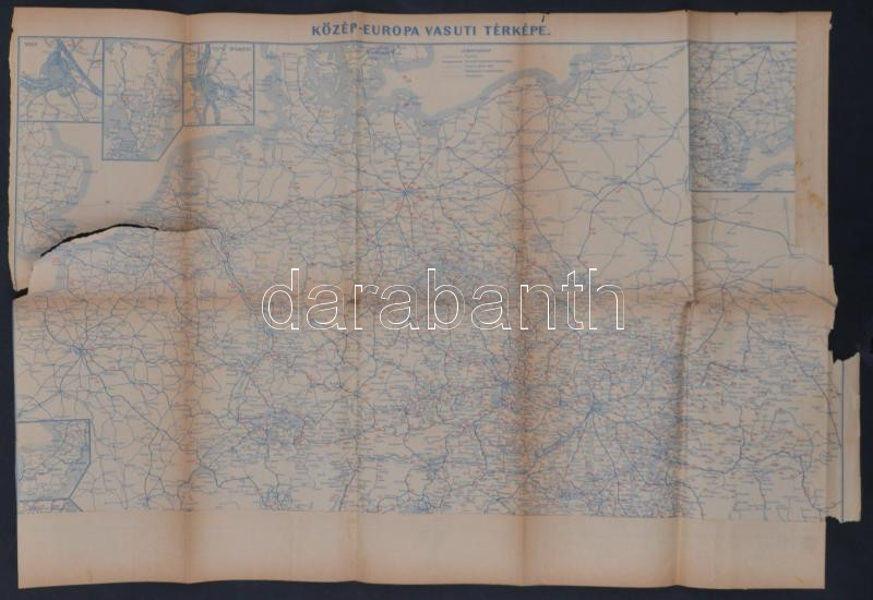 Vegyes térkép tétel: 1. Közép-Európa vázlatos vasúti térképe; 2. Közép-Európa vasúti térképe; 3. Budapest 1930; 3. Székesfővárosi autóbuszüzem, 1930 (4 db); 5. Budapest kézi térképe, 1:25000, 1927; 6. Budapest egész területének térképe, 1:25000, melléklet a Budapesti czím- és lakásjegyzék 1928. évi évfolyamához; 7. Budapest egész területének térképe, 1922; 8. Budapest egész területének térképe, 1919. Félvászon kötésű mappába kötve, egy-kettő szakadásokkal