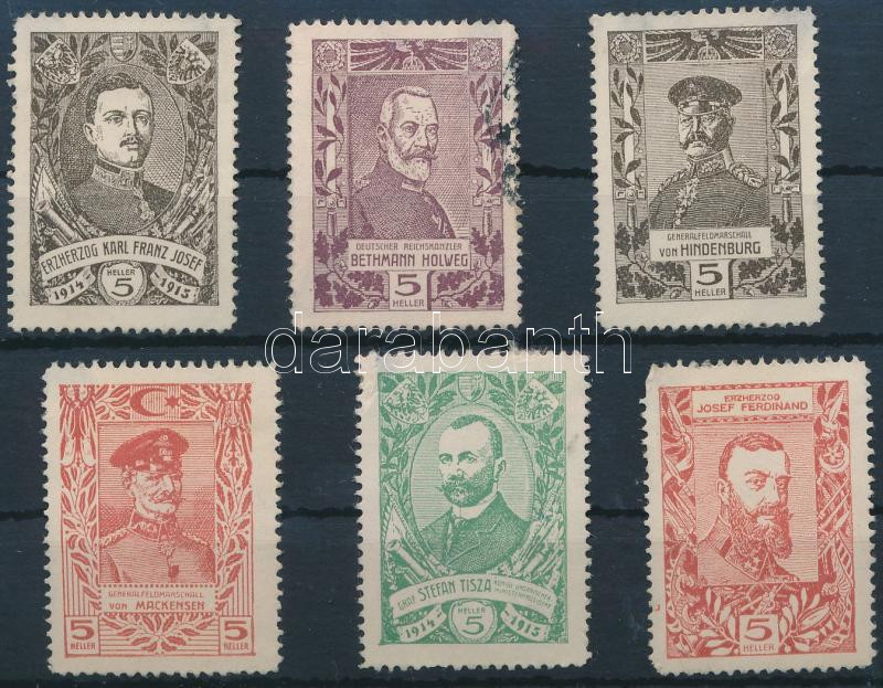 Beschreibung: A Habsburg uralkodóház tagjai, osztrák-magyar és német állami és katonai tisztviselők, 6 db klf adománybélyeg