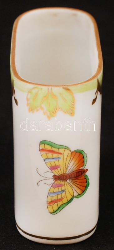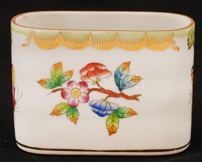 Beschreibung: Herendi Viktória mintás fogpiszkálótartó, kézzel festett, jelzett, apró kopásnyomokkal, 8×3×6 cm