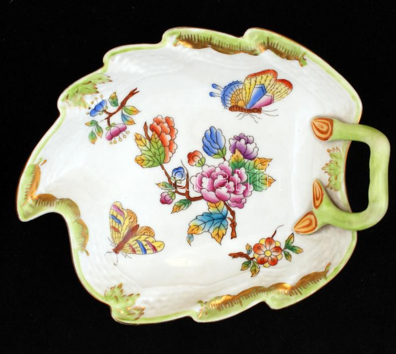 Beschreibung: Herendi Viktória mintás porcelán leveles tálka, kézzel festett, jelzett, apró kopásnyomokkal, 14,5×11,5 cm