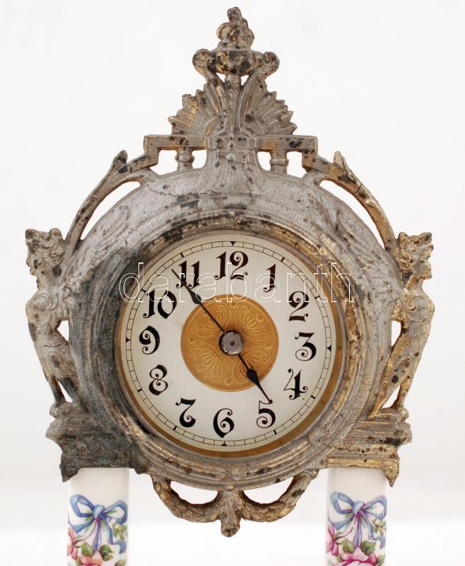 Beschreibung: cca 1930 Mechanikus fém kandalló óra virágokkal díszített matricás kerámia oszlopokkal, működő óraszerkezettel, m: 31 cm, 17x10 cm