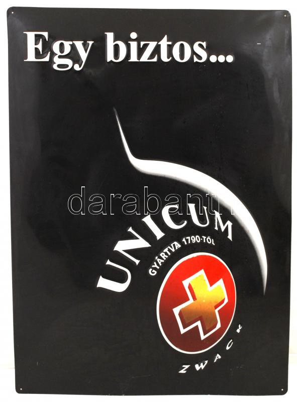 Beschreibung: "Egy biztos... Unicum" Nagyméretű Unicum festett fémlemez reklámtábla, kis kopásnyomokkal, egyébként jó állapotban, 68,5×49 cm