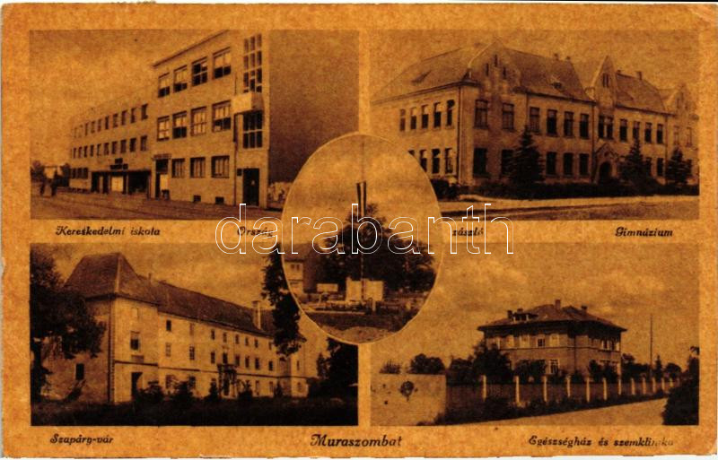 Muraszombat, Kereskedelmi iskola, országzászló, gimnázium, Szapáry vár, egészségház és szemklinika / Commercial school, country flag, high school, castle, hospital (EK)