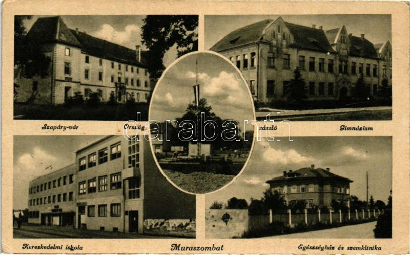 Muraszombat, Kereskedelmi iskola, országzászló, gimnázium, Szapáry vár, egészségház és szemklinika, Faflik József felvételei / Commercial school, country flag, high school, castle, hospital