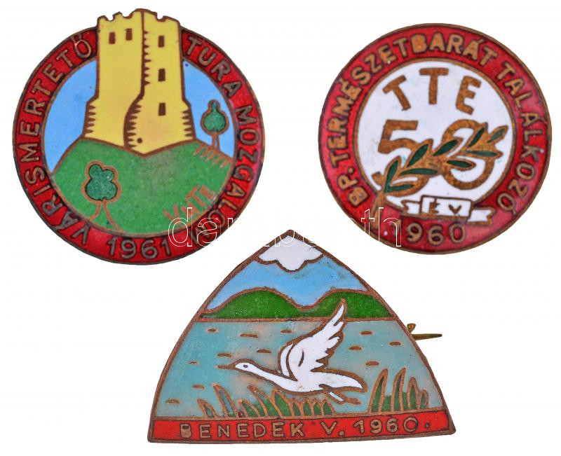 Beschreibung: 1960-1961. 3xklf zománcozott tombak túrázó jelvény, közte 1961. "Várismertető Tura Mozgalom" T:2
