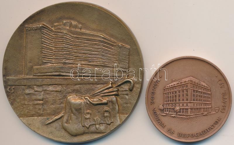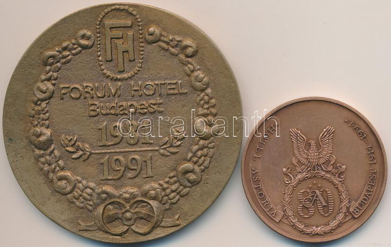 Csontos László (?) (1925-) 1991. "10 éves a Forum Hotel" emlékplakett dísztokban (70mm) + Bozó Gyula (1913-2004) 1994. "Hotel Astoria Budapest 1914-1994 / Vándor voltam és befogadtatok (Máté, 25)" Br emlékérem (42,5mm) T:2