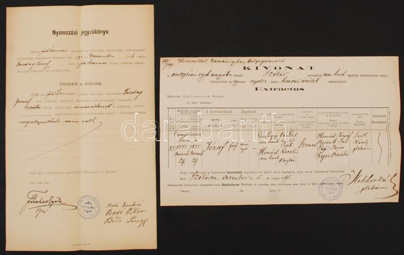 1895 Nyomozási jegyzőkönyv és Keresztelési Kivonat https://www.darabanth.com/de/232-Fernauktion/232.0/Andere-Sammelgebiete/Drucksachen~400010/1895-Nyomozasi-jegyzokonyv-es-Keresztelesi-Kivonat~II1051260