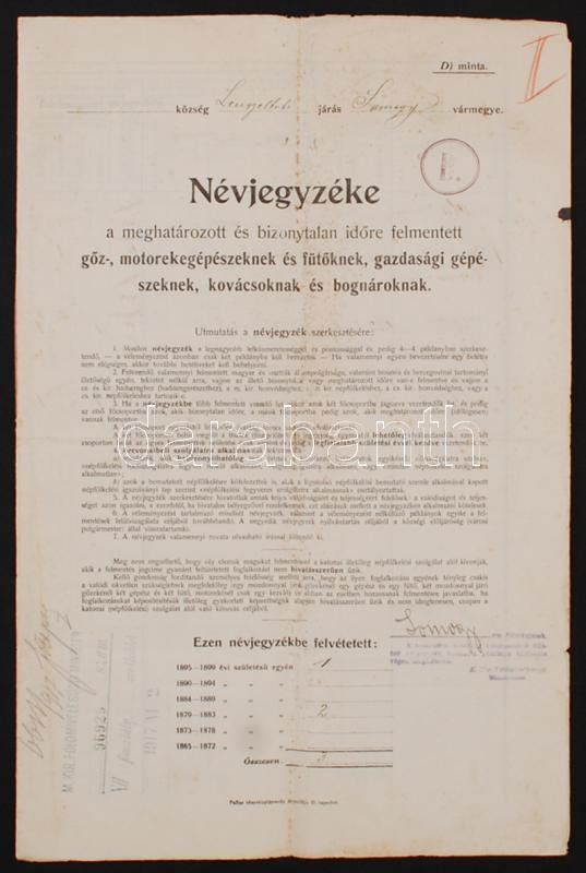 1917 Kitöltött nyomtatvány: Névjegyzéke a meghatározott és bizonytalan időre felmentett gőz-,motorekegépészeknek és fűtőknek, gazdasági gépészeknek, kovácsoknak és bognároknak.