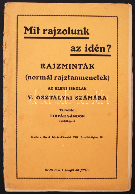 1927 Mit rajzolunk az idén? Rajzminták (normál rajztanmenetek) az elemi iskolák V. osztályai számára. Terv.: Tirpák Sándor. Bp., Szent István Társulat. Papírkötésben, jó állapotban.