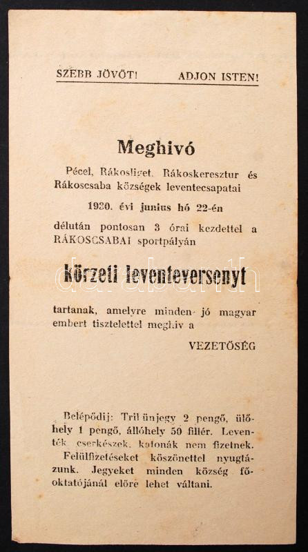 1930 Rákoscsaba, Meghívó a Pécel, Rákosliget, Rákoskeresztúr és Rákoscsaba községek számára a rákoscsabai sportpályán tartandó körzeti leventeversenyre
