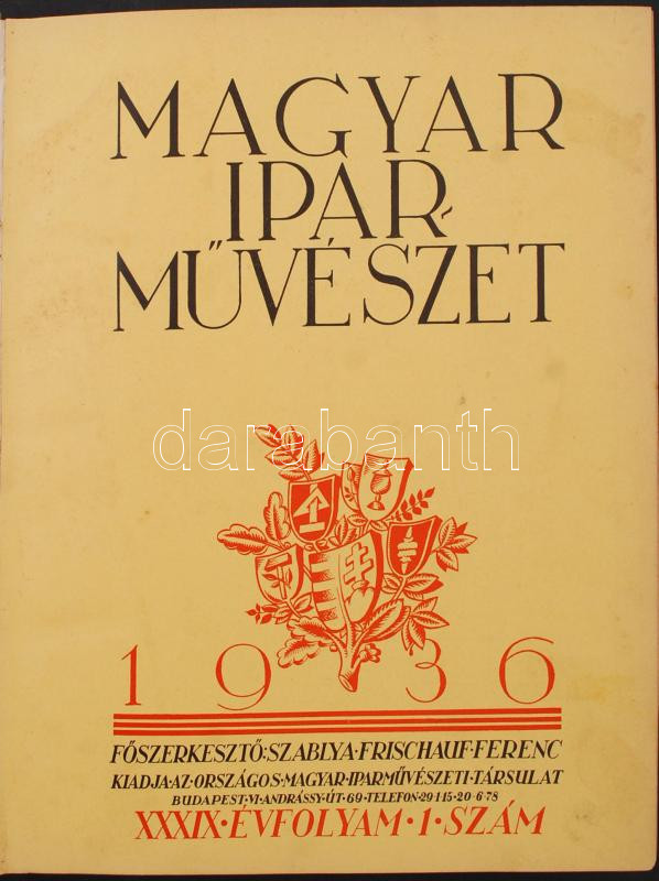1936 Magyar Iparművészet. Az Országos Magyar Iparművészeti Múzeum és Iskola és az Orsz. Magyar Iparművészeti Társulat Közlönye. XXXIX. évf. 1936. Szerk: Szablya Fischauf / Spolarich. Korabeli, félvászon kötésben, jó állapotban