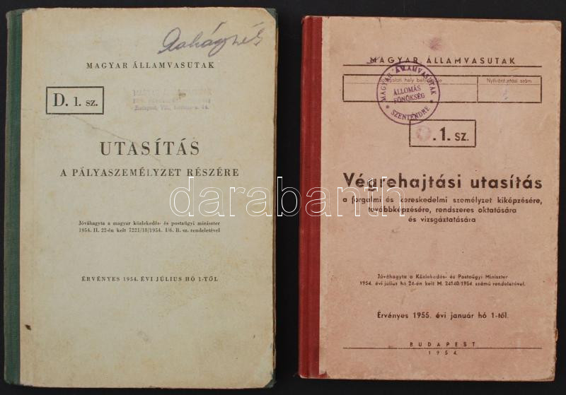 1954 2 db MÁV-utasítás: Végrehajtási utasítás a forgalmi és kereskedelmi személyzet kiképzésére, továbbképzésére, rendszeres oktatására és vizsgáztatására. Bp., 1954. Félvászon kötésben, jó állapotban.; Utasítás a pályaszemélyzet részére. Bp., 1954. Félvászon kötésben, jó állapotban.