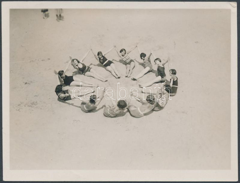 Beschreibung: 1929 Budapest, Szigeti starnd, Szentpál Olga tánccsoportjának tagjai körben hajladozva, feliratozott fotó az iskola arcívumából, 9x11,5 cm