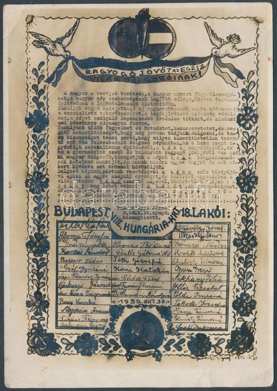 cca 1952. október 30. Kordokumentum fotópapíron sokszorosítva a magyar és szovjet nép barátságáról, Tiszavölgyi József házmegbízott megfogalmazásában és a Bp., VIII. ker., Hungária krt. 18. lakói által aláírva, 18x12 cm