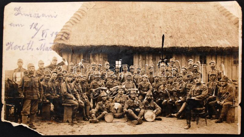 Beschreibung: 1917 Katonazenekar fotója, hátulján feliratozva, tanúsítvánnyal, sarkán kis szakadással, 10×17,5 cm