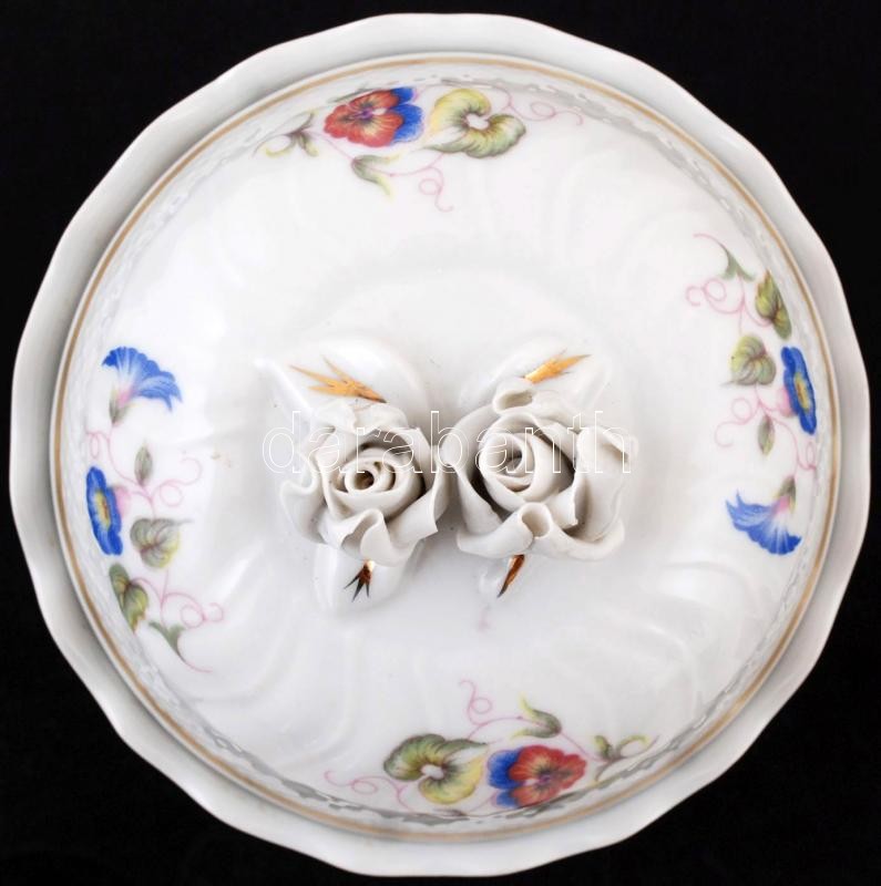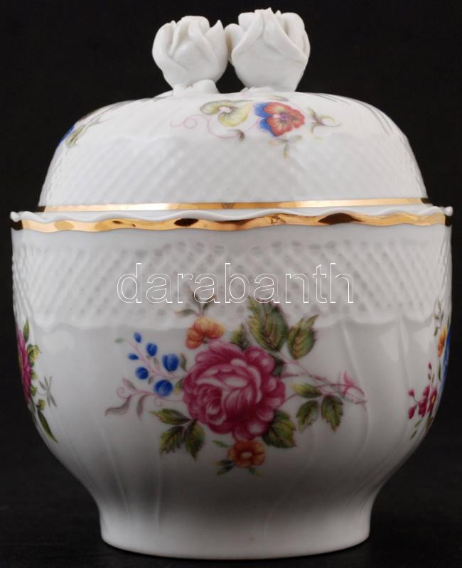 Beschreibung: Hollóházi virágmintás porcelán bonbonier, matricás, jelzett, apró kopásnyomokkal, m: 13,5 cm