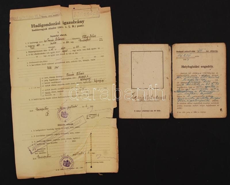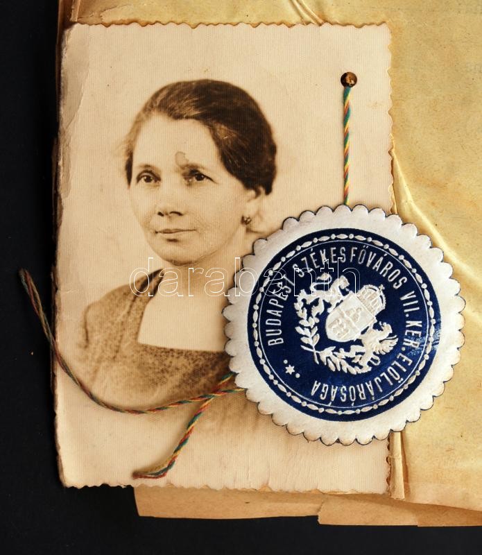 1935-1944 Budapest székesfőváros VII. kerület elöljárója által kiadott helyfoglalási engedély gyümölcsárusítás, kukoricafőzés és gesztenyesütés céljára, benne fényképes hadigondozási igazolvánnyal, rajta pecsétbélyeggel