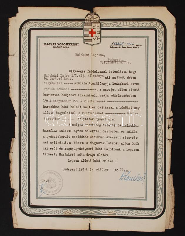 1944 Bp., A Magyar Vöröskereszt Tudósító Irodájának gyászjelentése https://www.darabanth.com/de/233-Fernauktion/233.0/Andere-Sammelgebiete/Dokument~400016/1944-Bp-A-Magyar-Voroskereszt-Tudosito-Irodajanak-gyaszjelentese~II1060711