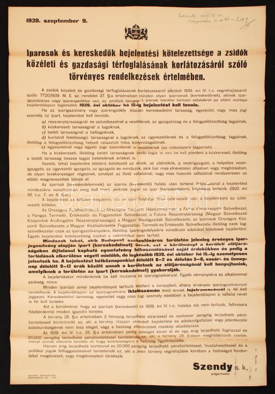 1939 Budapest Székesfőváros által kiadott nagyméretű hirdetmény az iparosok és kereskedők bejelentési kötelezettségéről a zsidók közéleti és gazdasági térfoglalásának korlátozásáról szóló törvényes rendelkezések értelmében, 62x90 cm