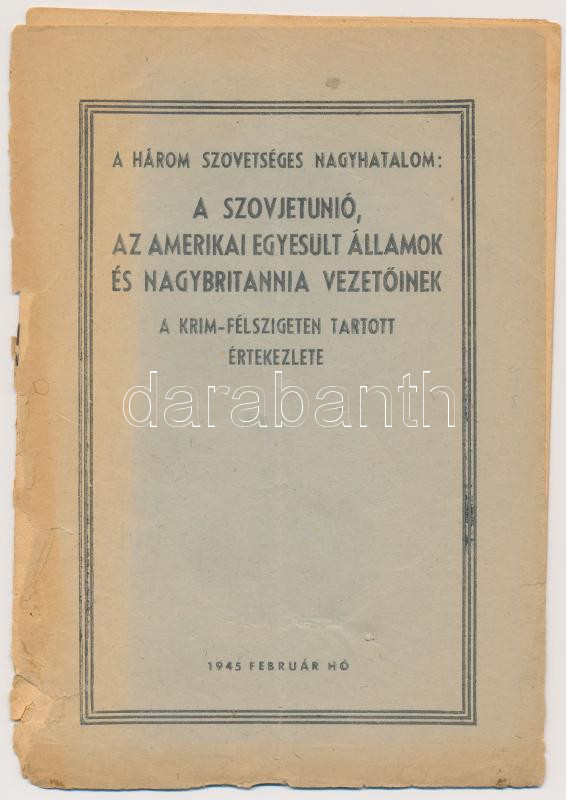 1945 A három szövetséges nagyhatalom: A szovjetunió, az Amerikai Egyesült Államok és Nagybritannia vezetőinek a Krim-Félszigeten tartott értekezlete. Kiadói papír kötésben, viseltes állapotban.