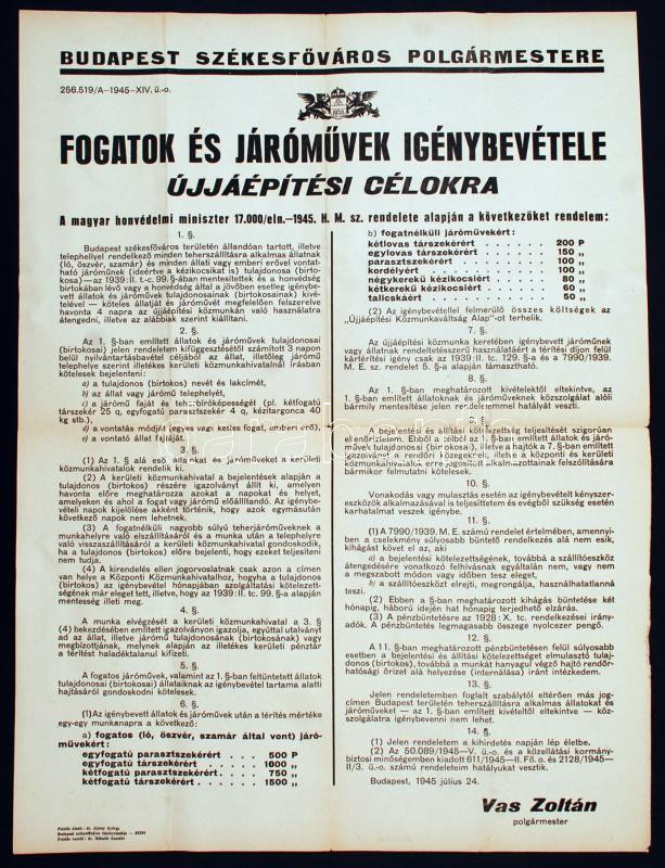 1945 Bp., Budapest székesfőváros polgármestere által kiadott hirdetmény a fogatok és járművek újjáépítési célokra való igénybevételéről, mely szerint minden igavonó állatott és járművet havonta 4 napra kell újjáépítési munkára átengedni, 47x63 cm
