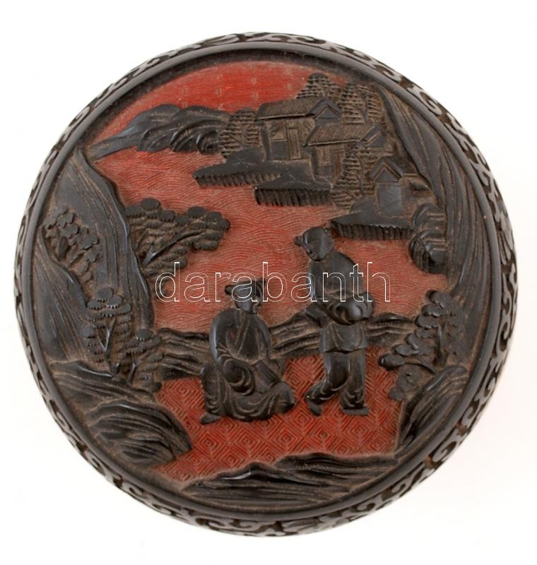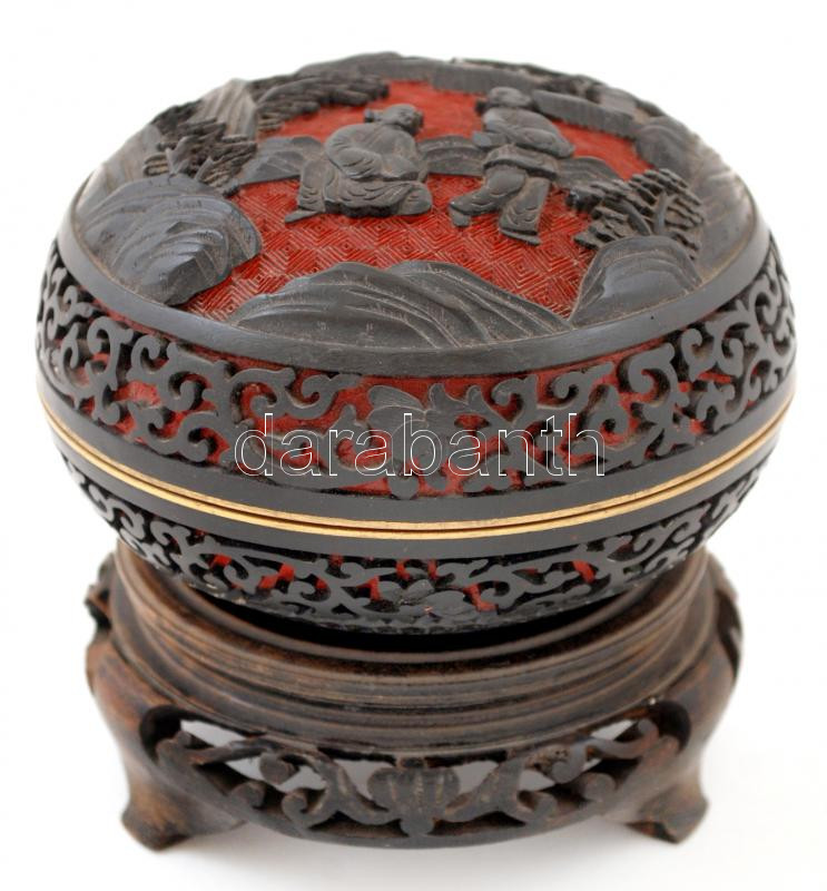 Kínai vörös-fekete lakkfaragásos bonbonnière keleti motívumokkal, fém, zománcozott belsővel, jelzés nélkül, kicsit sérült fa talapzaton, d: 11 cm /