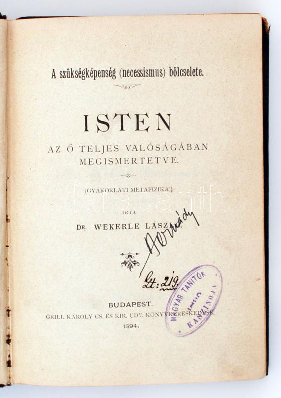 Wekerle László: A szükségképenség (necessimus) bölcselete. Isten az ő teljes valóságában megismertetve (gyakorlati metafizika). Bp., 1894, Grill Károly. Kissé szakadt, kopottas vászonkötésben, egyébként jó állapotban.