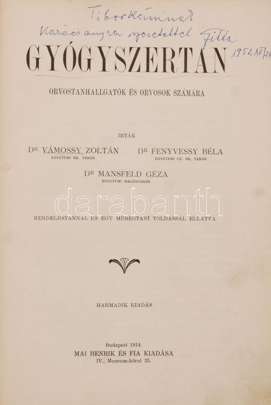Vámossy Zoltán dr., Fenyvessy Béla dr., Mansfeld Géza dr.: Gyógyszertan Orvostanhallgatók és orvosok számára. Rendeléstannal és egy méregtani toldással ellátva. Budapest, 1914, Mai Henrik és Fia . Félvászon kötésben.