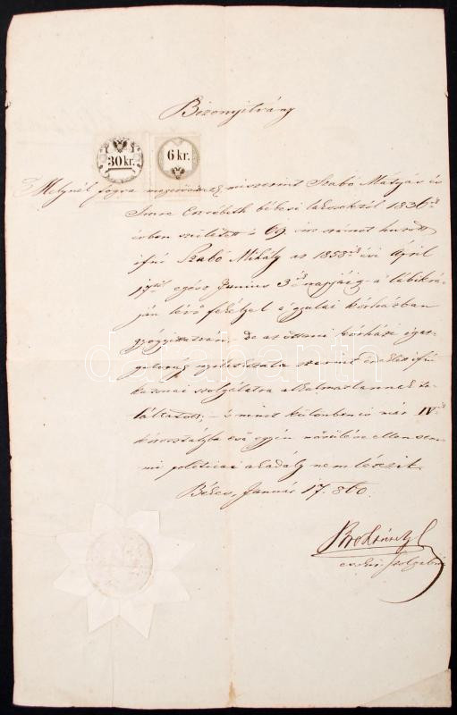Beschreibung: 1860 Békés, házasságkötési engedély és igazolás katonai szolgálatra való alkalmatlanságról, 30 kr és 6 kr okmánybélyeggel