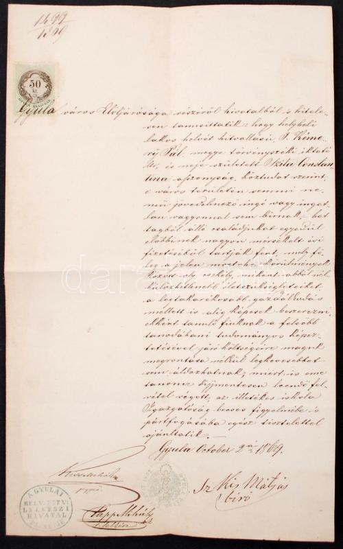 1869 Gyula Kézzel írt, magyar nyelvű szegénységi bizonyítvány, 50 kr o... https://www.darabanth.com/de/234-Fernauktion/234.0/Andere-Sammelgebiete/Dokument~40033/1869-Gyula-Kezzel-irt-magyar-nyelvu-szegenysegi-bizonyitvany-50-kr-okmanybelyeggel~II1070984