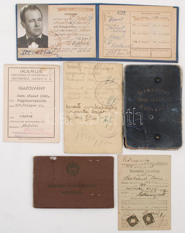 1900-1971 Vegyes okmány tétel, igazolványok:Zenész Szövetség, Tiborc M... https://www.darabanth.com/de/234-Fernauktion/234.0/Andere-Sammelgebiete/Dokument~40033/1900-1971-Vegyes-okmany-tetel-igazolvanyokZenesz-Szovetseg-Tiborc-Muveszegyuttes-Ikarus~II1065578