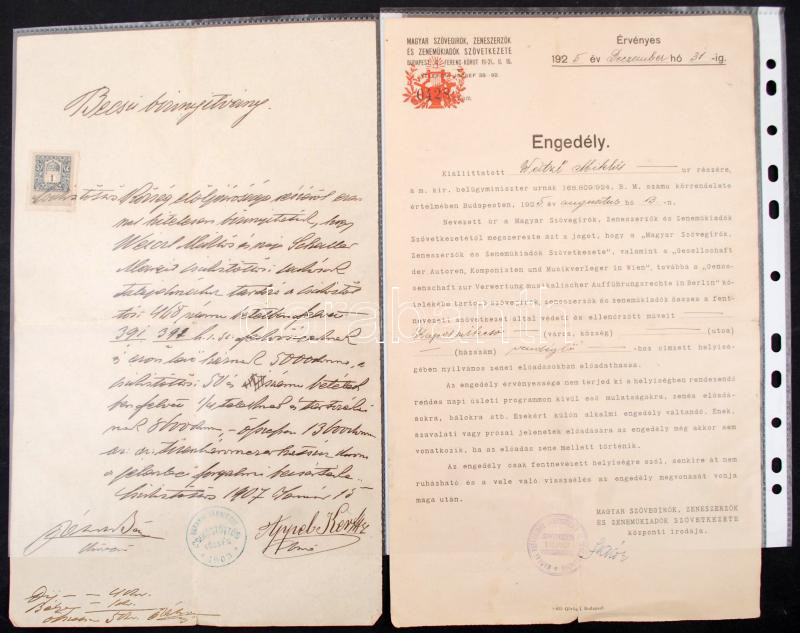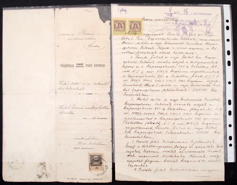 1907-1945 Vegyes okmány tétel(birtoklap, csere szerződés, tulajdonjog iránti kérvény, engedély, házassági anyakönyvi kivonat stb.) okmánybélyegekkel, 12 db