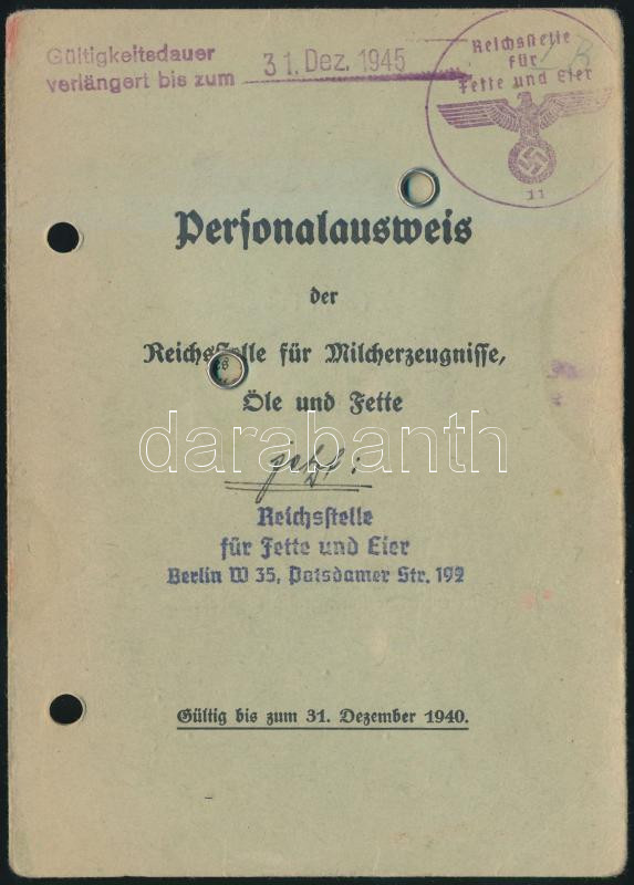 1939 A "Reichstelle für Milcherzeugnisse, Öle und Fette" által kiállított fényképes személyi igazolvány /