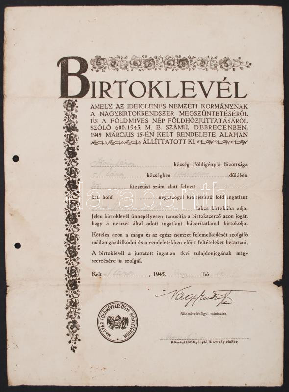 1945 Sövényháza Földigénylő Bizottsága által kiállított, kitöltött bir... https://www.darabanth.com/de/234-Fernauktion/234.0/Andere-Sammelgebiete/Dokument~40033/1945-Sovenyhaza-Foldigenylo-Bizottsaga-altal-kiallitott-kitoltott-birtoklevel~II1065804